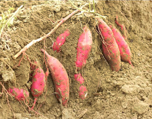 原来是李信同时种植“西瓜红”和“烟薯25”两个品种,意外地出现了杂交,偶然产出了一个新品种。这个新品种果肉饱满,香甜细糯,结合了前两个品种的优点,得出了“1+1 >2”的可喜结果。李信还给这个新品种取了个好听的名字——“香蜜薯”。